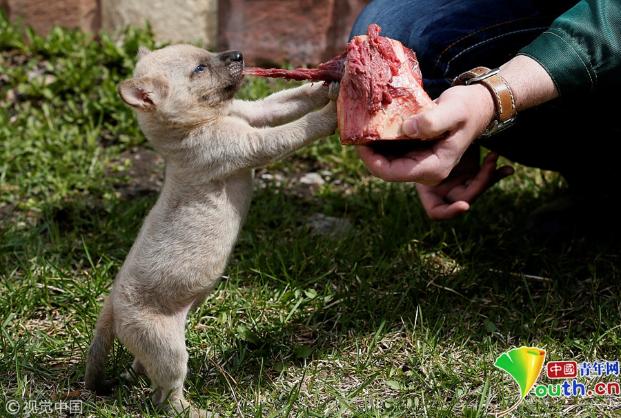 當(dāng)?shù)貢r間2018年5月11日,俄羅斯克拉斯諾雅茨克,當(dāng)?shù)貏游飯@飼養(yǎng)員給一只1月大的印度野狗Gelya喂食。