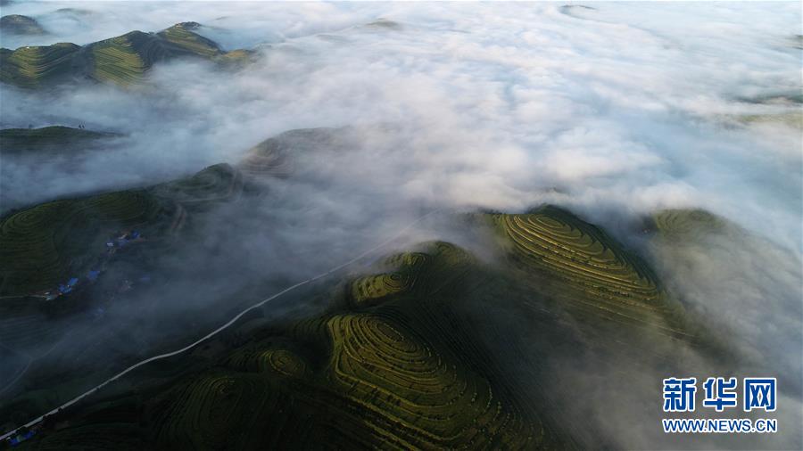 云霧繚繞的寧夏彭陽縣金雞坪梯田公園(7月17日攝)。新華社記者 王鵬 攝