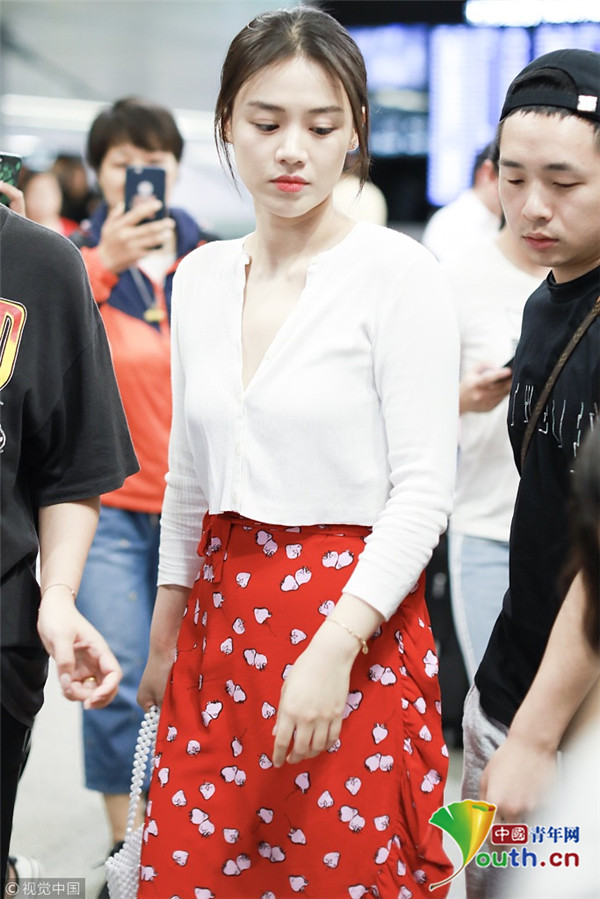 2018年7月31日,“水月”馬思純從北京飛往上?,F(xiàn)身機場,她身穿草莓圖案大紅裙,手提櫻桃小竹籃,造型清新甜美,搭配深V白襯衫,美胸若隱若現(xiàn),平添小性感。