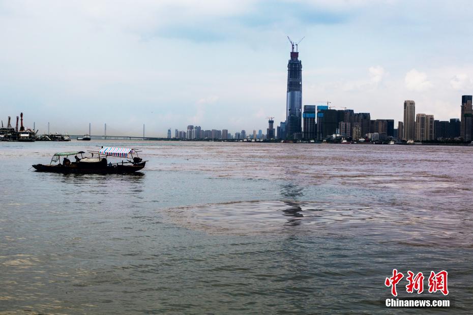 7月14日,一艘漁船停在長江和漢江交匯處,從漢陽南岸嘴望去漢江(左)與長江(右)“涇渭分明”。中新社記者 張暢 攝