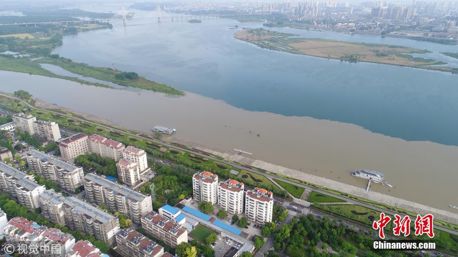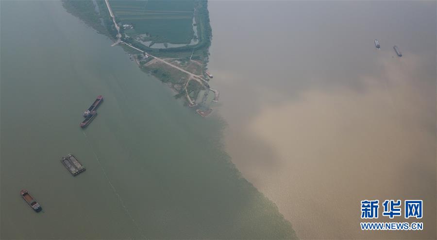 7月10日,航拍長江與南京秦淮河交匯處,江水與河水“涇渭分明”。當(dāng)日,江蘇水利廳發(fā)布的水情信息顯示,長江南京段水位已降至警戒線以下。中新社記者泱波 攝