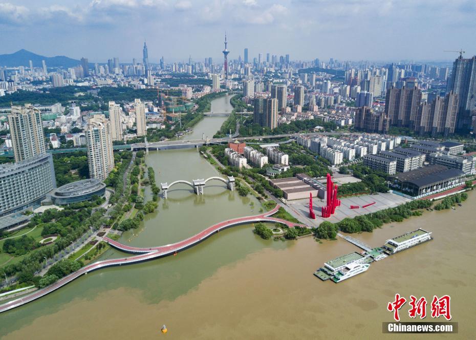 7月10日,航拍長江與南京秦淮河交匯處,樹木淹入水中。當(dāng)日,江蘇水利廳發(fā)布的水情信息顯示,長江南京段水位已降至警戒線以下。中新社記者泱波 攝