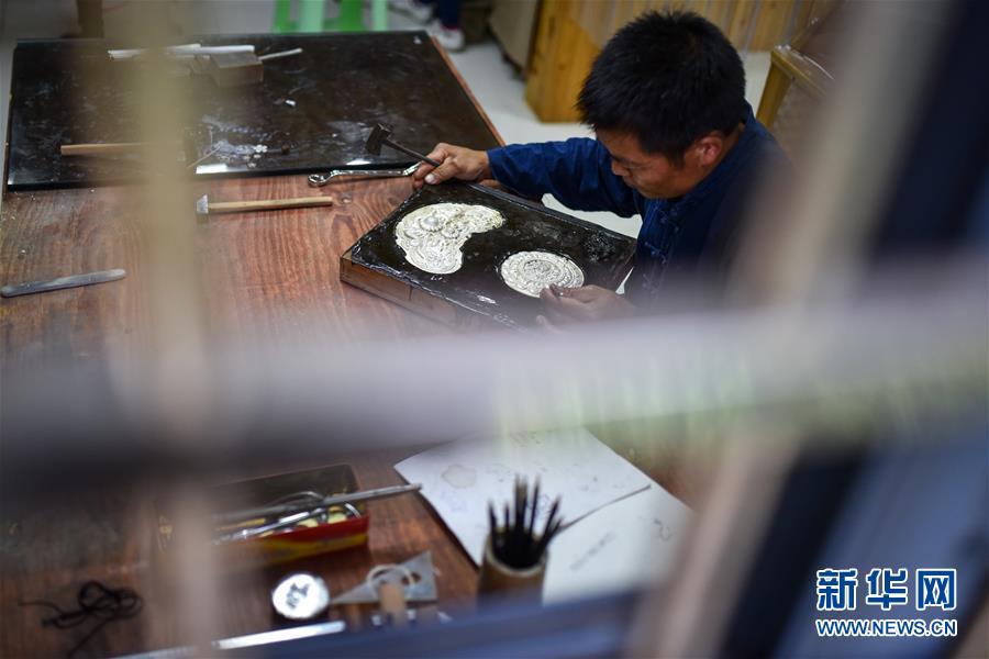 龍懂陽的弟弟龍?zhí)栆彩倾y飾工藝傳人。和哥哥不同,弟弟主打的是銀飾文化體驗(yàn)游,用自家傳統(tǒng)苗寨開設(shè)民宿,游客在此居住的同時(shí),還能學(xué)習(xí)體驗(yàn)銀飾品制作。每年暑期一到,家長(zhǎng)孩子絡(luò)繹不絕。新客源、新銷路、新模式帶動(dòng)雷山縣銀飾業(yè)不斷發(fā)展壯大,成為脫貧攻堅(jiān)的重要產(chǎn)業(yè)。2017年,雷山縣控拜、麻料、烏高三個(gè)村銀飾品及相關(guān)產(chǎn)業(yè)銷售額超過1.5億元,吸引很多外出打工的年輕人回家創(chuàng)業(yè)。苗寨鍛銀聲在綠水青山間響遍千戶,也漸漸走出大山,聲名遠(yuǎn)播。新華社記者 李芒茫 攝