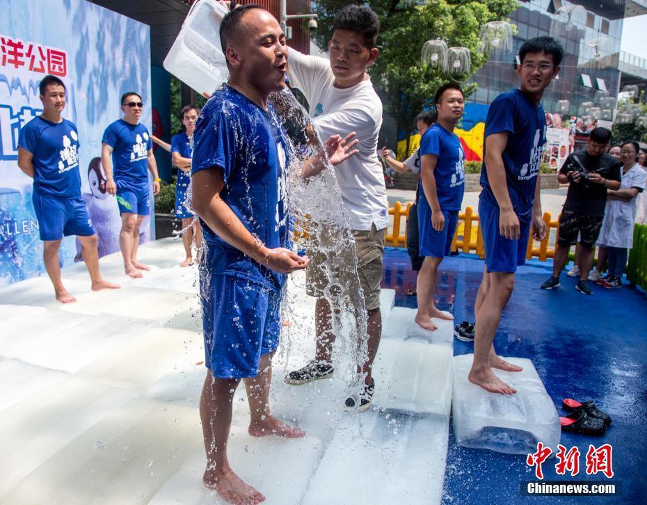8月11日,在企鵝館舉行的決賽中,工作人員給參賽選手桶里加冰塊。當(dāng)日,一場(chǎng)充滿趣味性的“冰極挑戰(zhàn)賽”在武漢海昌極地海洋世界上演,參賽者們經(jīng)過(guò)“極地初體驗(yàn)”和“極寒企鵝館耐寒挑戰(zhàn)”兩個(gè)環(huán)節(jié),堅(jiān)持時(shí)間長(zhǎng)者獲勝。中新社記者張暢 攝