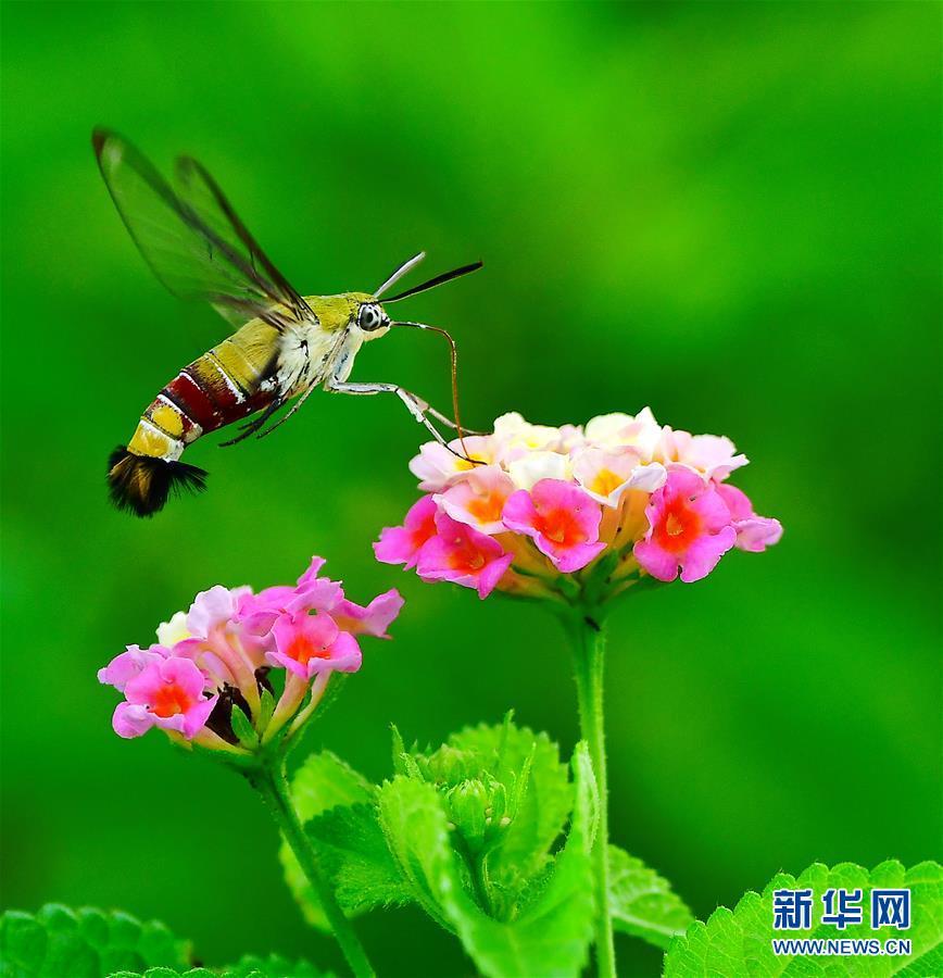 在福建省福州市溫泉公園,透翅天蛾在花間飛舞(8月18日攝)。近日,福建省福州市溫泉公園內(nèi)的馬纓丹大面積開放?;t、草綠、蟲飛,構(gòu)成了一幅和諧的閩都生態(tài)圖景。 新華社記者梅永存攝