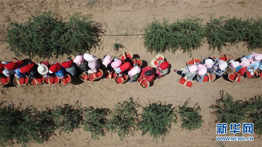 紅寺堡生態(tài)移民區(qū)的移民在百瑞源枸杞種植基地排隊將采摘的枸杞稱重(5月30日無人機拍攝)。近日,在寧夏吳忠市紅寺堡區(qū)百瑞源枸杞種植基地,頭茬枸杞迎來采摘收獲季。今年頭茬枸杞采摘期比往年提前20天左右。據(jù)了解,該基地地處紅寺堡生態(tài)移民區(qū),占地3000畝,采摘季節(jié)每天有數(shù)百名當(dāng)?shù)匾泼裨谔镩g采摘勞作。新華社記者王鵬 攝