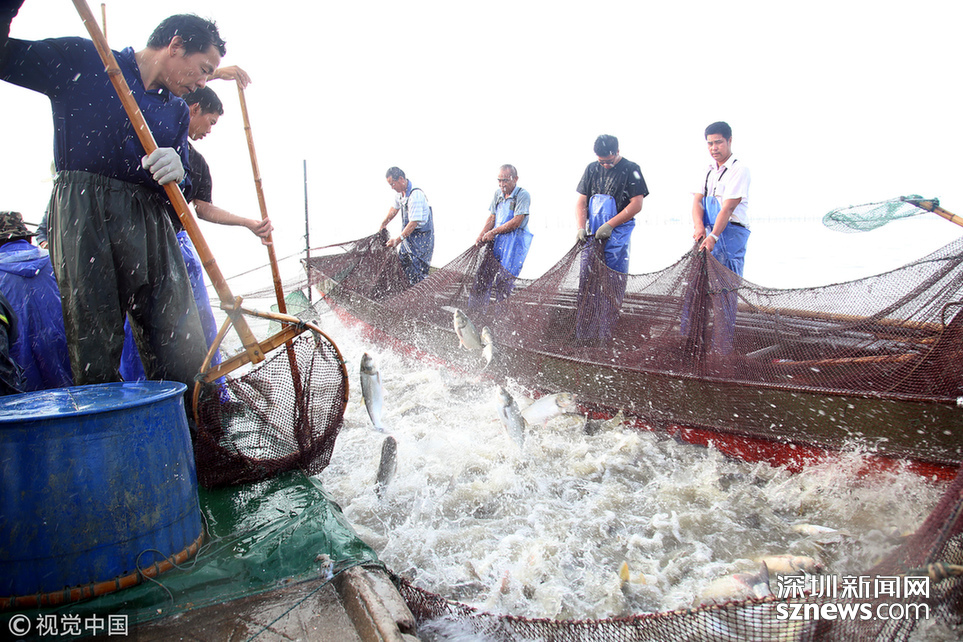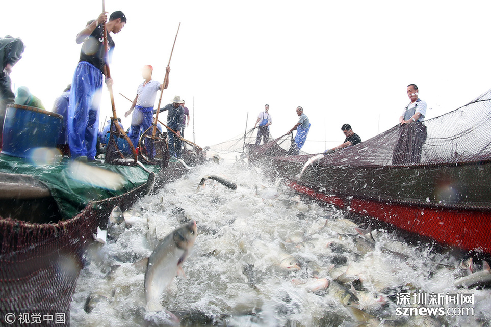 ???? 2018年6月26日,江蘇省常州市嘉澤鎮(zhèn)捕撈村的漁民組織夏季捕撈,一網(wǎng)魚達五萬余斤,以鰱魚為主,供應市場需求。夏捕的魚價較平時有所上漲,漁民粗略估計可增收上萬余元。