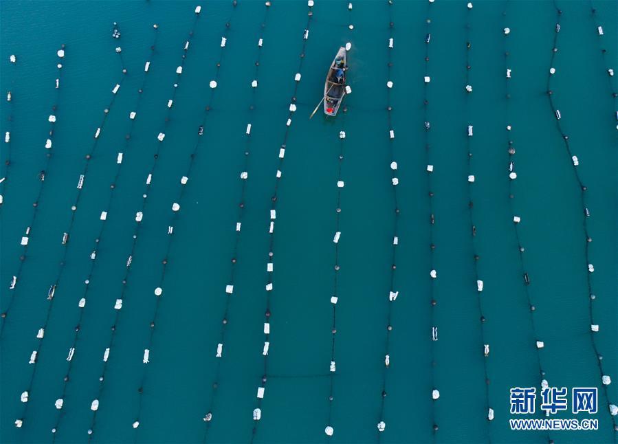 8月18日,南麂島馬祖岙海灣內(nèi),養(yǎng)殖戶乘船在貽貝養(yǎng)殖區(qū)內(nèi)作業(yè)(無人機拍攝)。進入8月,浙江省溫州市平陽縣南麂鎮(zhèn)海域上大片的大黃魚、貽貝等特色海產(chǎn)品養(yǎng)殖區(qū)域迎來豐收季節(jié),養(yǎng)殖戶們駕駛漁船在養(yǎng)殖區(qū)海域進行打撈收獲,在碧海藍天下構成了一幅“海上牧場”的美麗豐收景象。近年來,南麂鎮(zhèn)政府引導漁民養(yǎng)殖戶充分發(fā)揮“靠海吃?!钡馁Y源優(yōu)勢,大力發(fā)展海洋養(yǎng)殖經(jīng)濟和海島旅游經(jīng)濟,實現(xiàn)了南麂由“生態(tài)美”向“產(chǎn)業(yè)美”,“產(chǎn)業(yè)美”向“經(jīng)濟美”的轉(zhuǎn)變。同時該鎮(zhèn)堅持以大黃魚、貽貝等為特色產(chǎn)業(yè)支撐,精準發(fā)展高效海洋養(yǎng)殖業(yè),重點培養(yǎng)一批新型職業(yè)漁民,依靠專業(yè)技術支持,實現(xiàn)深海仿生養(yǎng)殖,讓好生態(tài)造就好品質(zhì),重點打造南麂養(yǎng)殖品牌,組建營銷網(wǎng)絡,拓展特色海產(chǎn)品市場。新華社記者 徐昱攝
