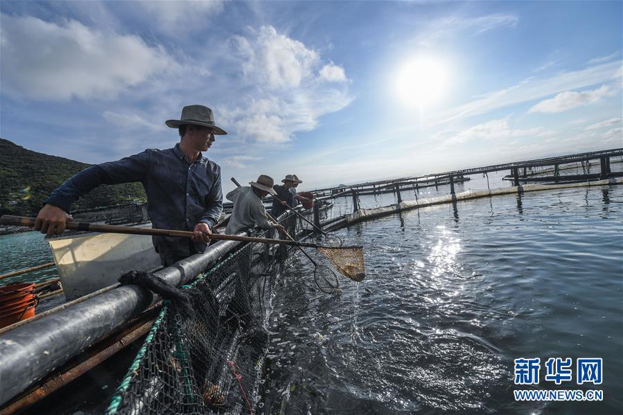 8月18日,南麂島海域的“海上牧場”養(yǎng)殖區(qū)內(nèi),漁民正捕撈大黃魚,處于仿生養(yǎng)殖環(huán)境的大黃魚需要生長2至3年。進入8月,浙江省溫州市平陽縣南麂鎮(zhèn)海域上大片的大黃魚、貽貝等特色海產(chǎn)品養(yǎng)殖區(qū)域迎來豐收季節(jié),養(yǎng)殖戶們駕駛漁船在養(yǎng)殖區(qū)海域進行打撈收獲,在碧海藍天下構成了一幅“海上牧場”的美麗豐收景象。近年來,南麂鎮(zhèn)政府引導漁民養(yǎng)殖戶充分發(fā)揮“靠海吃?!钡馁Y源優(yōu)勢,大力發(fā)展海洋養(yǎng)殖經(jīng)濟和海島旅游經(jīng)濟,實現(xiàn)了南麂由“生態(tài)美”向“產(chǎn)業(yè)美”,“產(chǎn)業(yè)美”向“經(jīng)濟美”的轉(zhuǎn)變。同時該鎮(zhèn)堅持以大黃魚、貽貝等為特色產(chǎn)業(yè)支撐,精準發(fā)展高效海洋養(yǎng)殖業(yè),重點培養(yǎng)一批新型職業(yè)漁民,依靠專業(yè)技術支持,實現(xiàn)深海仿生養(yǎng)殖,讓好生態(tài)造就好品質(zhì),重點打造南麂養(yǎng)殖品牌,組建營銷網(wǎng)絡,拓展特色海產(chǎn)品市場。新華社記者 徐昱攝