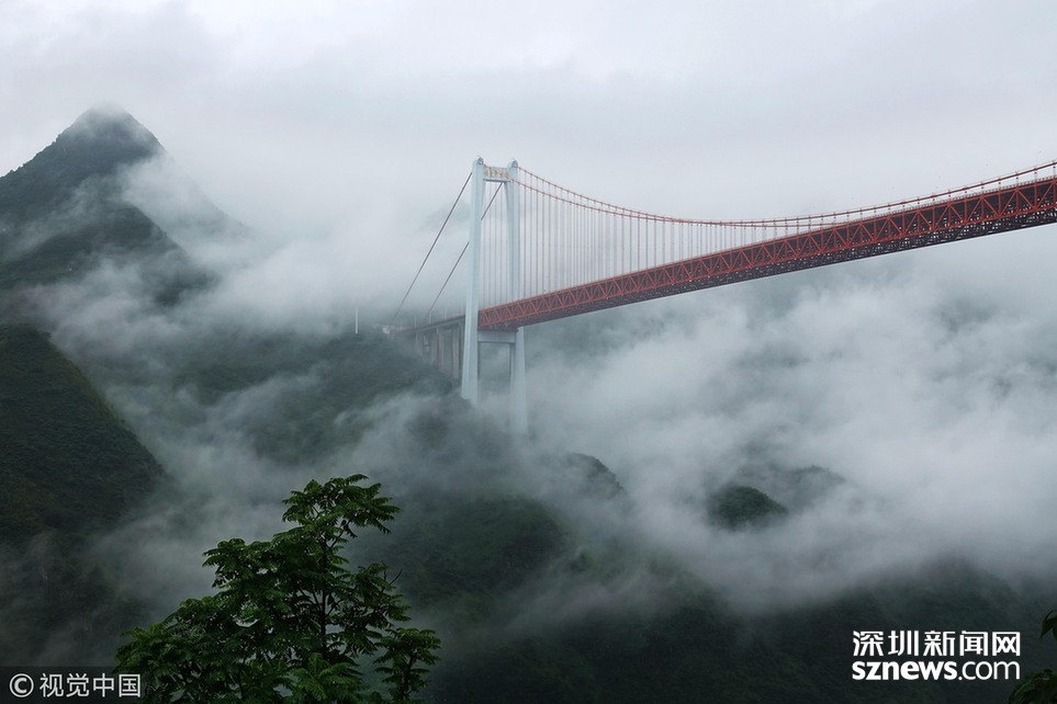 2018年6月26日,一場大雨后貴州省安順市關嶺縣壩陵河大峽谷云霧繚繞,橫跨兩岸的壩陵河大橋在云霧中時隱時現,更顯雄偉壯觀。
