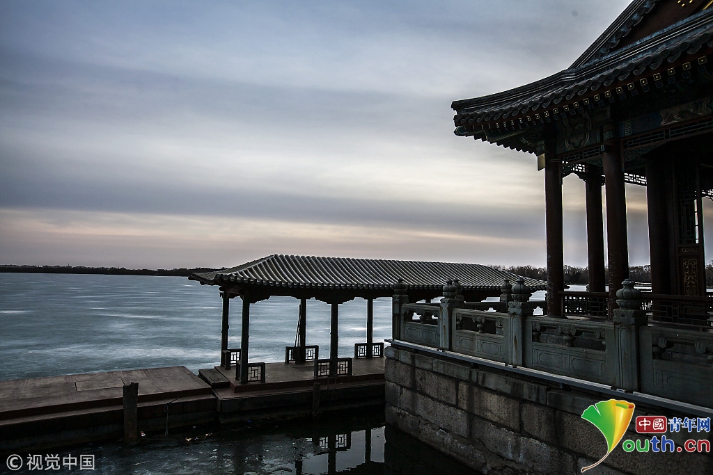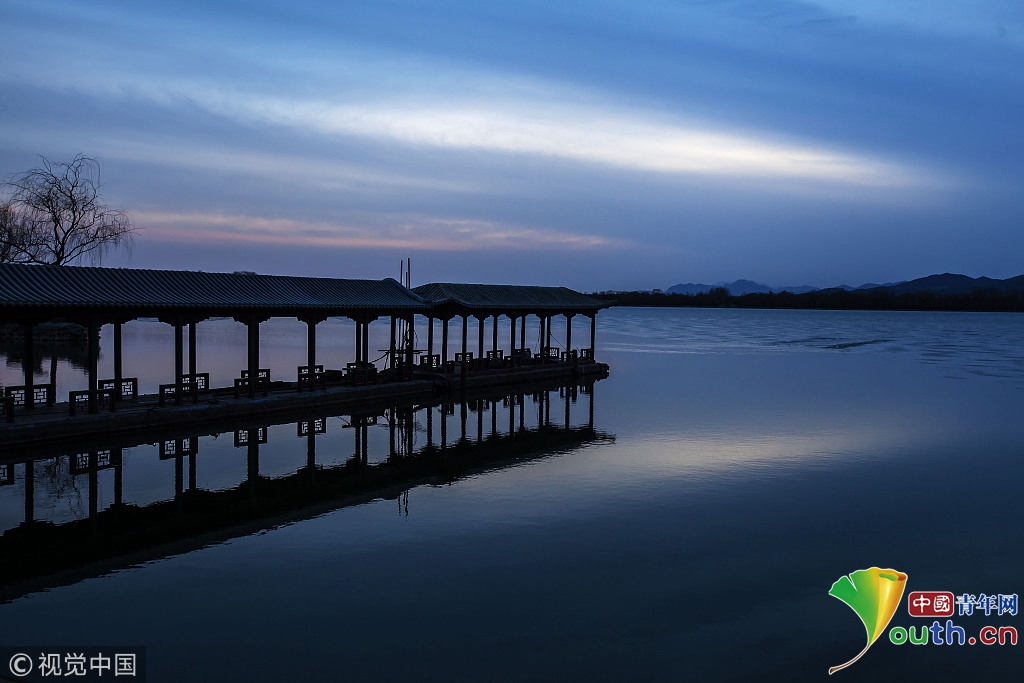 2018年2月23日,北京頤和園。當天日落時分昆明湖上空出現(xiàn)夕陽余暉的美景,夢幻般的色彩將古老的皇家園林裝扮得美輪美奐,讓人流連忘返。來源:視覺中國