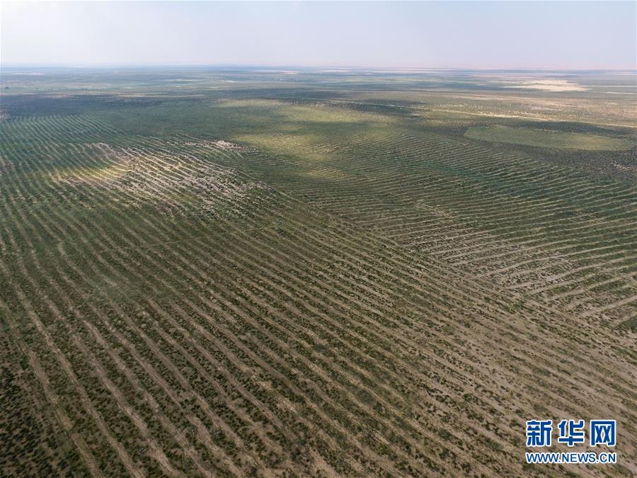 庫布其沙漠中的人工沙障(8月2日無人機拍攝)。 新華社記者劉磊攝