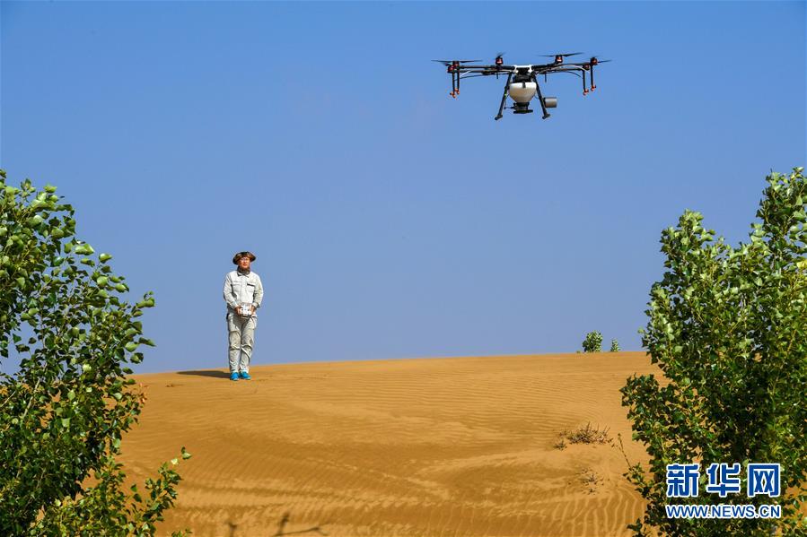 在內蒙古鄂爾多斯市杭錦旗的庫布其沙漠中,技術人員操控無人機飛播造林(7月11日攝)。 巍巍陰山南麓,鄂爾多斯高原之北,橫臥著一條長約400公里、寬5-65公里的黃色“長龍”。它似弓弦,將滔滔黃河拉出一個大大的“幾”字彎。 這是中國第七大、也是距北京最近的沙漠——庫布其沙漠,曾經寸草不生,風沙肆虐,被稱為“死亡之?!薄?/p> 幾十年來,庫布其人一代接著一代干,書寫了一部荒漠化治理的英雄史詩。 新華社記者 彭源 攝