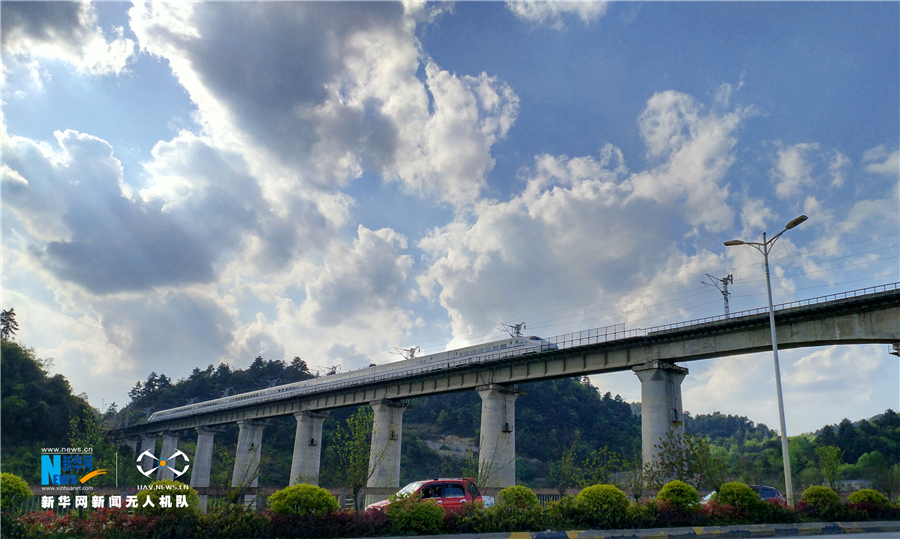貴州省地處中國西南腹地,全省高原山地居多,因此高鐵建設(shè)的橋隧占比較高。在貴陽市烏當(dāng)區(qū)新添寨,高鐵滬昆線、貴廣客運(yùn)專線、貴開城際客運(yùn)專線的隧道和橋梁交織在一起,形成“五洞五橋”并行,形似“五龍出?!钡膲延^景象。圖為3月29日,一輛動車在高鐵線路上運(yùn)行。新華網(wǎng)周遠(yuǎn)鋼 攝