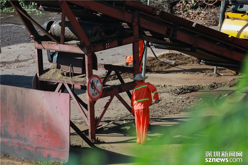 工作人員將遺漏在傳送帶下的碎料鏟出至臨時(shí)堆放處