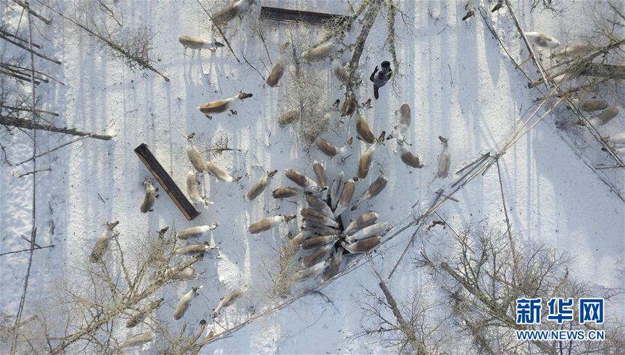 在內(nèi)蒙古大興安嶺根河林業(yè)局約安里林場,林場職工張國華在鹿圈補充飼料(2017年12月23日無人機拍攝)。新華社記者李任滋攝