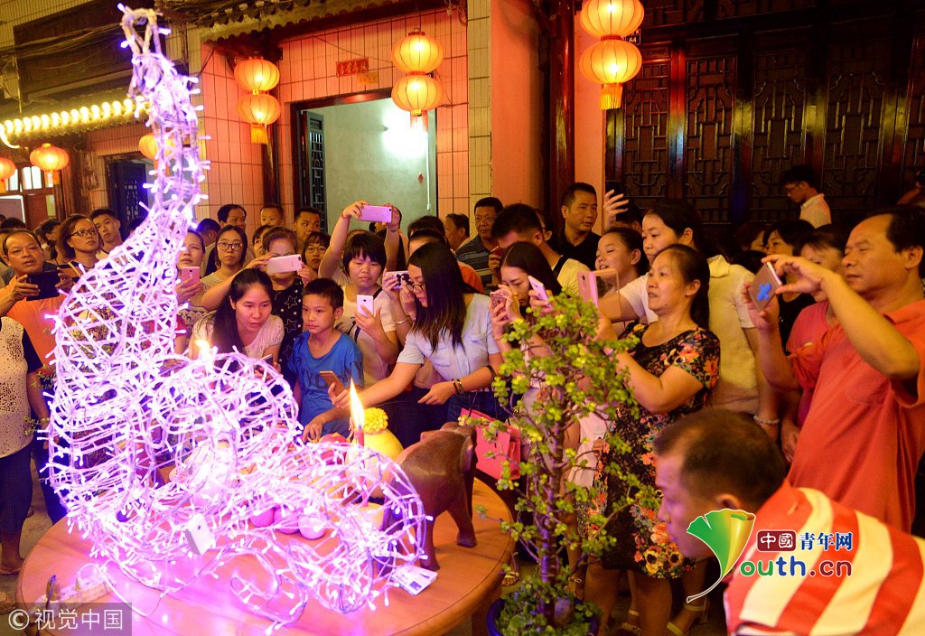 2016年9月15日晚,廣西來賓市忻城縣城關(guān)鎮(zhèn)城廂街舉行中秋節(jié)供月扎彩燈(走馬燈)民俗活動,5萬余名區(qū)內(nèi)外游客涌入老街,體驗獨特的文化魅力和民俗風(fēng)情,人們在老街內(nèi)賞月、賞花燈、品美食、拍照,流連忘返。