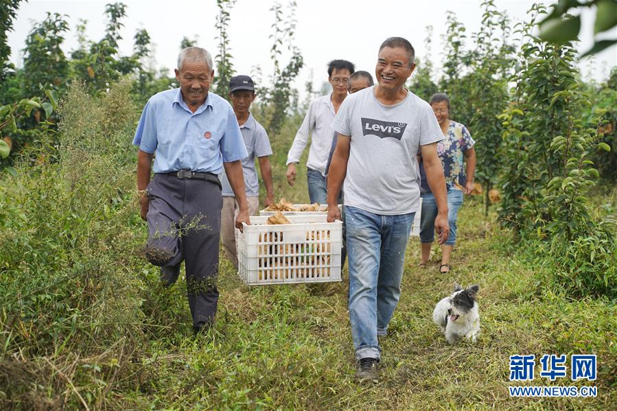 9月16日,小崗村梨園公社種植基地負(fù)責(zé)人黃慶昶(前右)與村民一同采摘“大吉梨”。新華社記者才揚攝