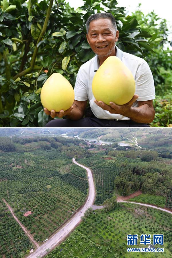 這張拼版照片顯示的是:上圖,9月18日,廣西武宣縣東鄉(xiāng)鎮(zhèn)風(fēng)沿村村民陳紹桂展示剛采摘的蜜柚;下圖,9月18日,人們?cè)陲L(fēng)沿村三紅蜜柚種植基地內(nèi)行走(無人機(jī)拍攝)。 新華社記者陸波岸攝