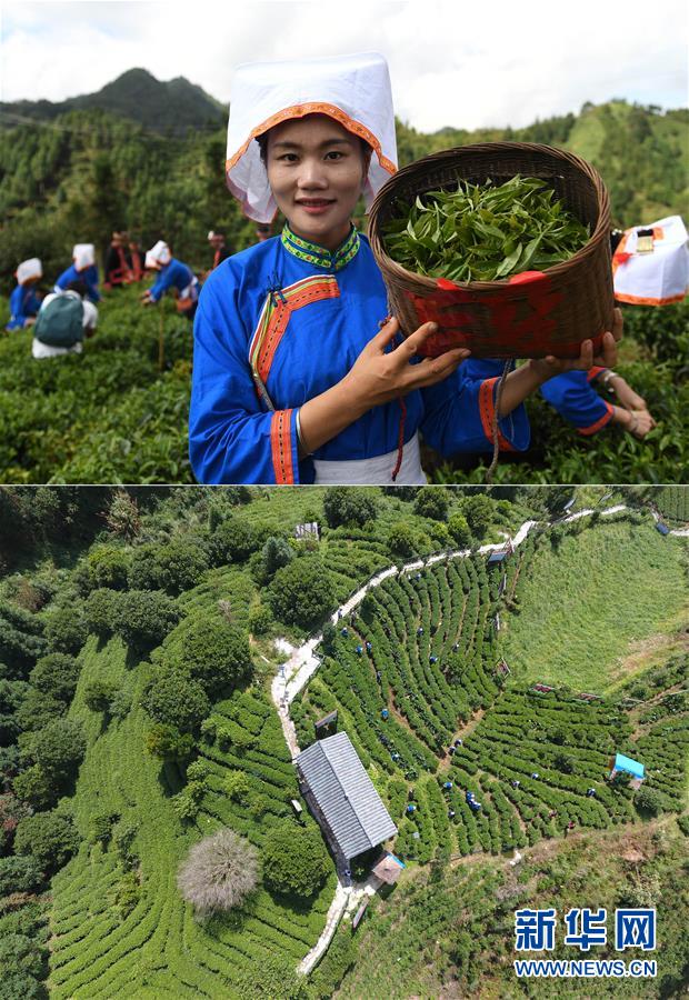 這張拼版照片顯示的是:上圖,9月20日,廣西金秀瑤族自治縣金秀鎮(zhèn)六段村村民蘇思林展示剛采摘的秋茶;下圖,9月20日,茶農(nóng)在金秀鎮(zhèn)六段村茶園內(nèi)采茶(無人機(jī)拍攝)。 新華社記者陸波岸攝