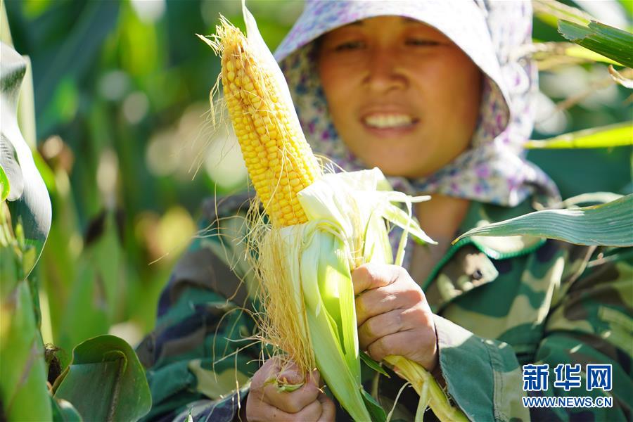 9月23日,河北省灤縣茨榆坨鎮(zhèn)西長(zhǎng)坨村農(nóng)民賈麗萍在展示收獲的玉米。