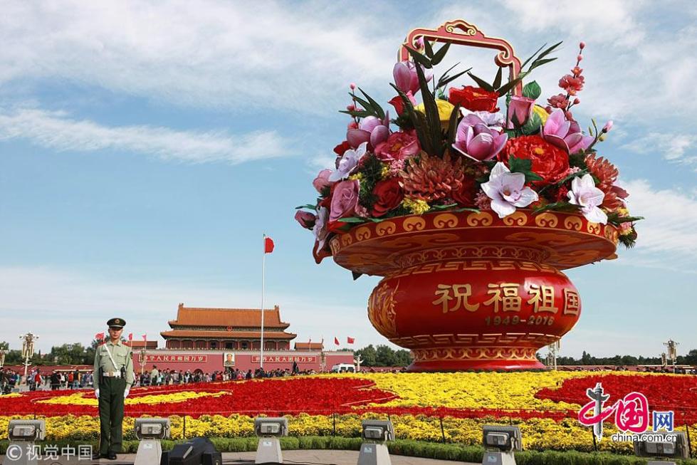 2011年10月04日,在北京蔚藍(lán)的天空下,“祝福祖國(guó)”的大型花壇屹立在天安門(mén)廣場(chǎng)中央。蘇陽(yáng)攝影
