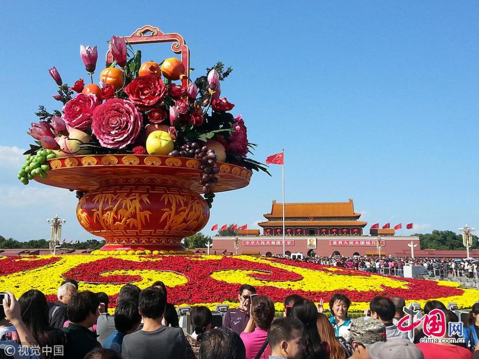 9月23日在北京天安門(mén)廣場(chǎng)拍攝的“祝福祖國(guó)” 巨型花籃。