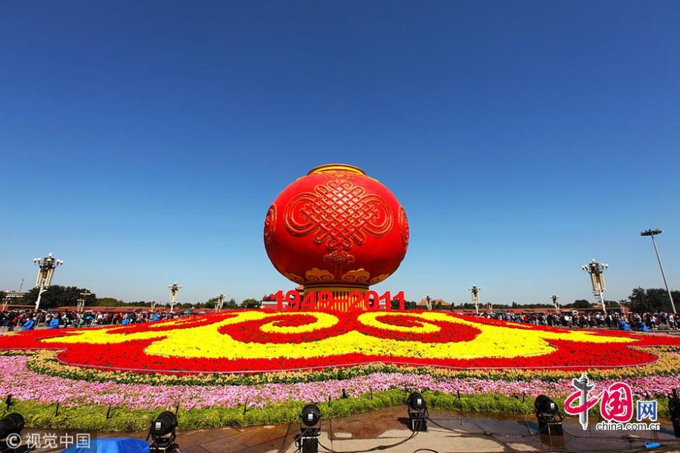 2011年天安門(mén)廣場(chǎng)中心花壇的主體部分為一只喜慶的大紅燈籠,底部襯托著由花草組成的祥云圖案,南北兩側(cè)分別立有“1949-2011”、“祝福祖國(guó)”等字符。燈籠、中國(guó)結(jié)、祥云等傳統(tǒng)元素,以及中國(guó)紅和金色等代表中國(guó)喜慶顏色的運(yùn)用,使花壇的中國(guó)傳統(tǒng)文化韻味十足?;▔w造型簡(jiǎn)潔、主題鮮明、熱烈喜慶,表現(xiàn)了對(duì)祖國(guó)繁榮富強(qiáng)、欣欣向榮的美好祝福。