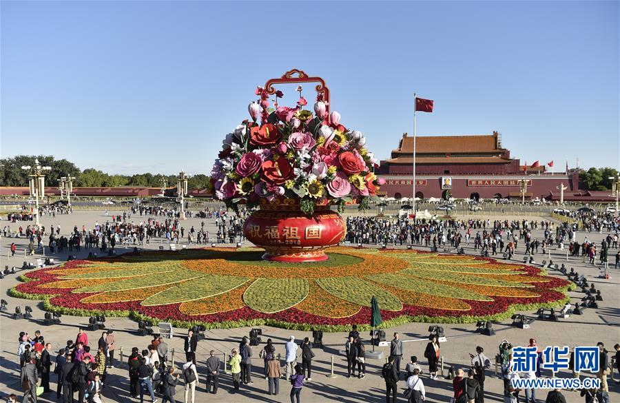 9月23日在北京天安門(mén)廣場(chǎng)拍攝的“祝福祖國(guó)” 巨型花籃。 新華社 李賀 攝