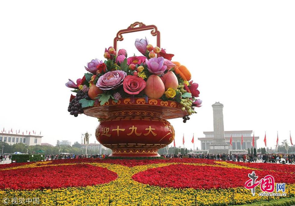 2017年天安門(mén)廣場(chǎng)大花籃以喜慶的花果籃為主景,花籃頂高17米,籃體高15.3米,底部直徑達(dá)50米?;@體南側(cè)寫(xiě)有“祝福祖國(guó)、1949-2017”,北側(cè)寫(xiě)有“喜迎十九大” 字樣?;ü@內(nèi)共使用主花56朵(牡丹、月季、玉蘭、金桂、迎春花、蘋(píng)果花、紫藤花、文心蘭、葉子花),其中最大牡丹直徑3.2米,果實(shí)6種(石榴、桃、柿子、蘋(píng)果、海棠、葡萄)。寓意吉祥的果實(shí)和花卉,象征十八大以來(lái),黨和國(guó)家在各個(gè)領(lǐng)域取得的輝煌成就,碩果累累。底部花壇采用心形圖案,寓意紅心向黨,象征著全國(guó)人民緊密團(tuán)結(jié)在以習(xí)近平同志為核心的黨中央周?chē)?,表達(dá)對(duì)祖國(guó)繁榮富強(qiáng)、欣欣向榮的美好祝福。