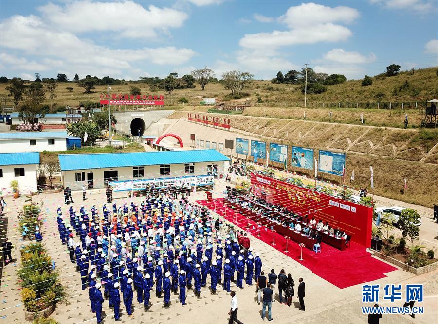 這是9月24日拍攝的內(nèi)羅畢-馬拉巴標(biāo)軌鐵路(內(nèi)馬鐵路)項(xiàng)目第一期恩貢隧道貫通儀式現(xiàn)場(chǎng)(航拍照片)。 由中國(guó)交通建設(shè)股份有限公司承建的內(nèi)羅畢-馬拉巴標(biāo)軌鐵路(內(nèi)馬鐵路)項(xiàng)目第一期恩貢隧道24日實(shí)現(xiàn)貫通。據(jù)悉,恩貢隧道全長(zhǎng)約4.5公里,是目前東非地區(qū)最長(zhǎng)的鐵路隧道。它的建成標(biāo)志著內(nèi)馬鐵路項(xiàng)目第一期取得了突破性進(jìn)展。 新華社記者王騰攝