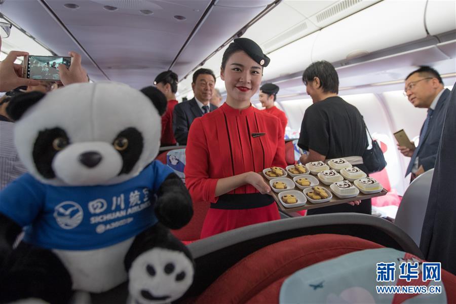 9月26日,在以色列特拉維夫本·古里安國際機(jī)場,四川航空公司空乘人員在機(jī)上展示熊貓主題的小吃。 新華社記者郭昱攝