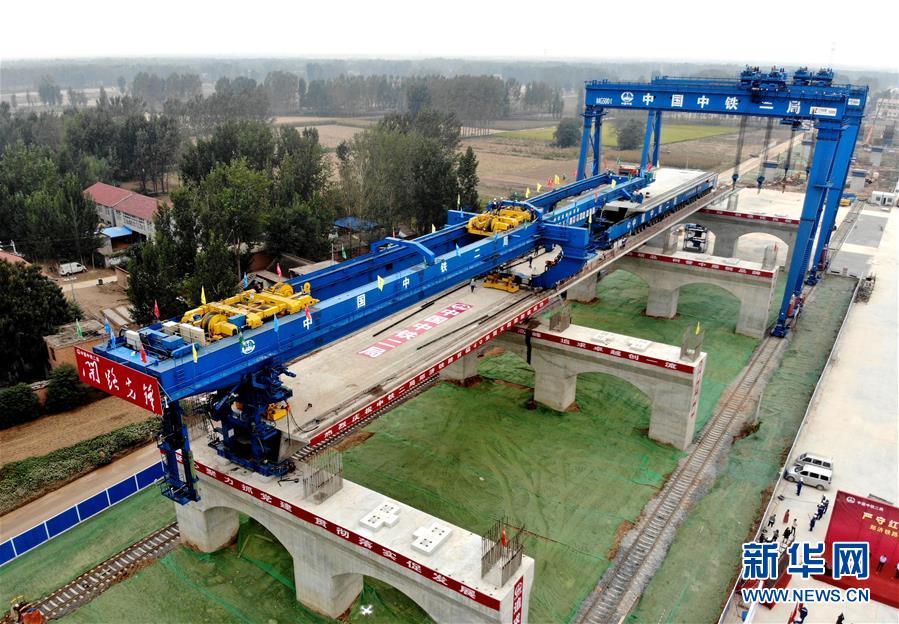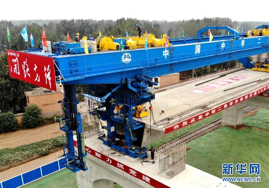 9月27日,中鐵二局的施工人員使用大型機械在鄭(州)濟(南)高速鐵路(鄭濮段)站前工程VI標施工現場架設40米簡支箱梁(無人機拍攝)。 新華社記者李安攝