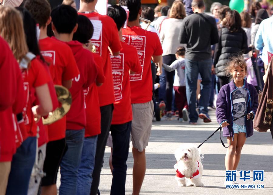 9月29日,在美國加利福尼亞州伯林蓋姆市,一支學(xué)生樂隊(duì)參加寵物狗大游行活動。美國加州舊金山灣區(qū)的伯林蓋姆市29日舉行寵物狗大游行活動。新華社記者吳曉凌攝
