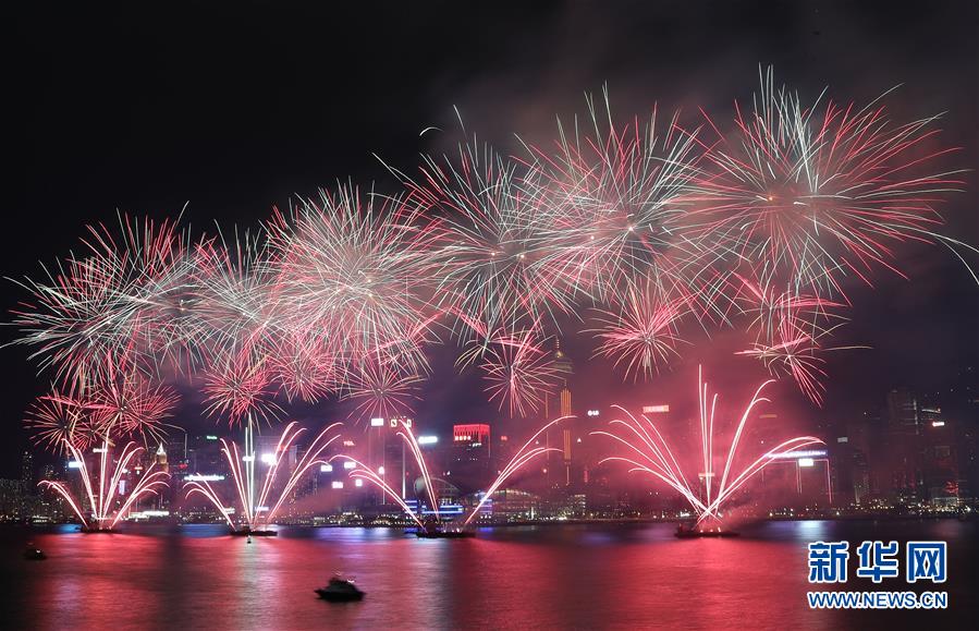 這是10月1日晚拍攝的香港維多利亞港煙花匯演。當(dāng)晚,香港維多利亞港舉行煙花匯演,慶祝中華人民共和國(guó)成立69周年。新華社記者李鋼攝