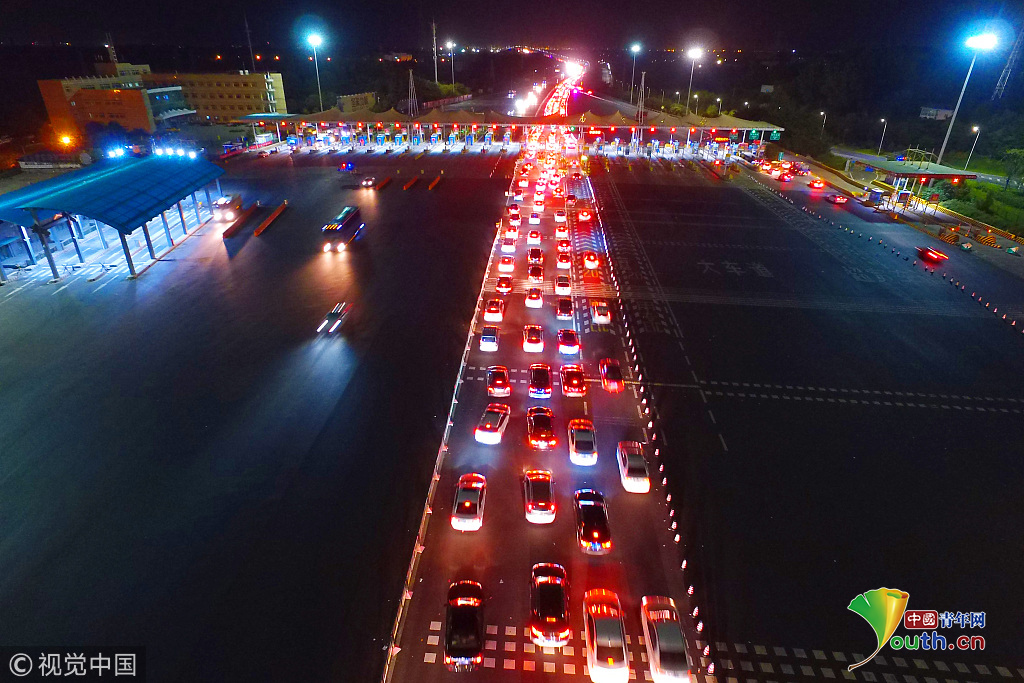 2018年10月1日,國慶假期首日凌晨1點(diǎn)左右,南京迎來出行高峰,所有高速公路出城方向迎來大批車輛,航拍南京長江二橋收費(fèi)站,大量車輛排起長龍,場面尤為壯觀。圖片作者:方東旭