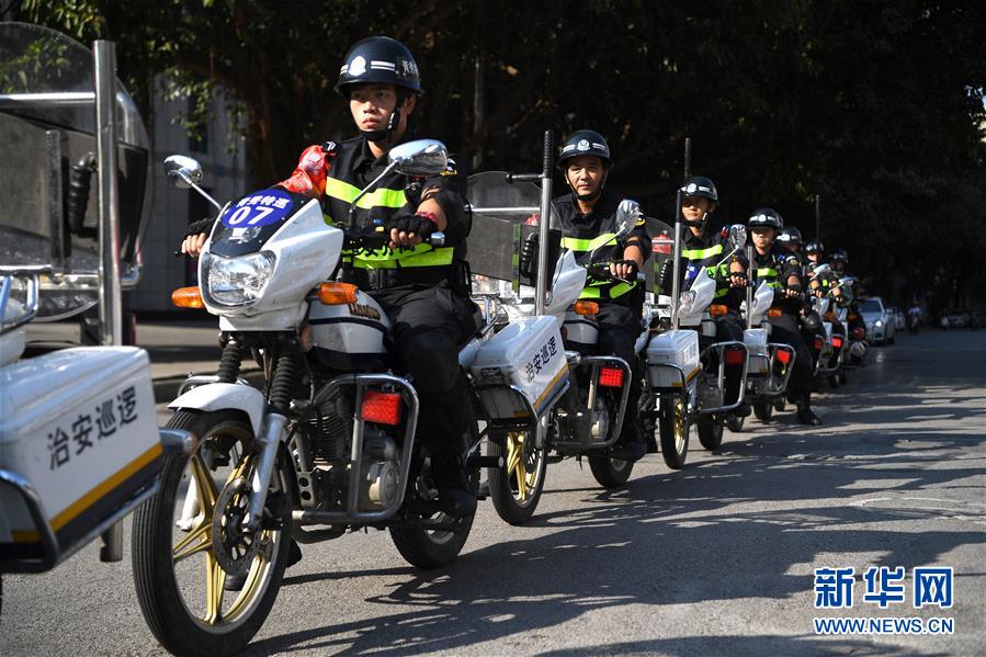 10月1日,廣西南寧市公安局南湖分局治安巡邏隊(duì)在南寧市東葛路上巡邏。當(dāng)日是國慶節(jié),許多勞動者堅(jiān)守在工作一線,在崗位上度過節(jié)日。新華社記者周華攝