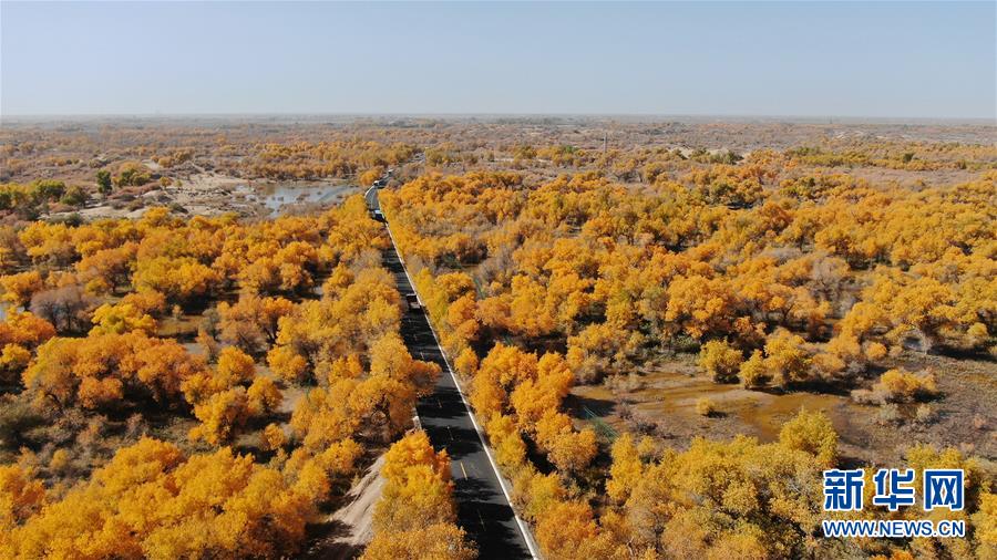 這是在內(nèi)蒙古自治區(qū)額濟納旗拍攝的胡楊林(10月10日無人機拍攝)。 金秋時節(jié),內(nèi)蒙古自治區(qū)額濟納旗胡楊林如同披上金裝,成為大漠中的一抹亮色,吸引眾多中外游客前來觀賞游玩。 新華社記者鄒予攝