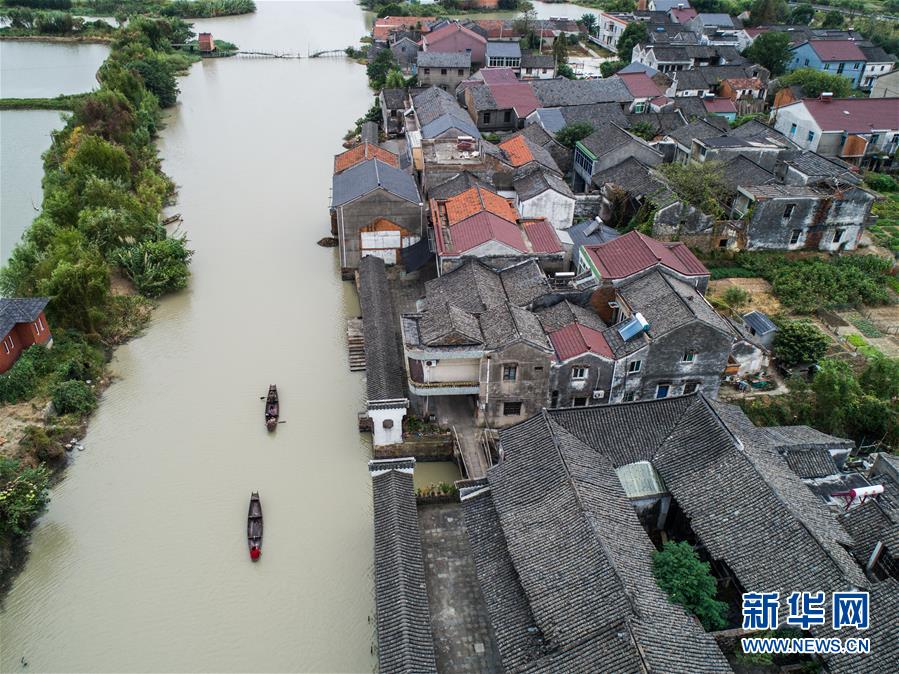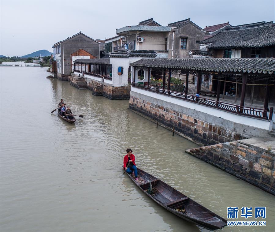 10月10日,泉家潭村村民劃著小船經(jīng)過沿河長廊(無人機(jī)拍攝)。經(jīng)過改造提升后,沿河長廊和整潔的古村街巷成為當(dāng)?shù)孛利愢l(xiāng)村的景觀帶。  新華社記者 徐昱 攝