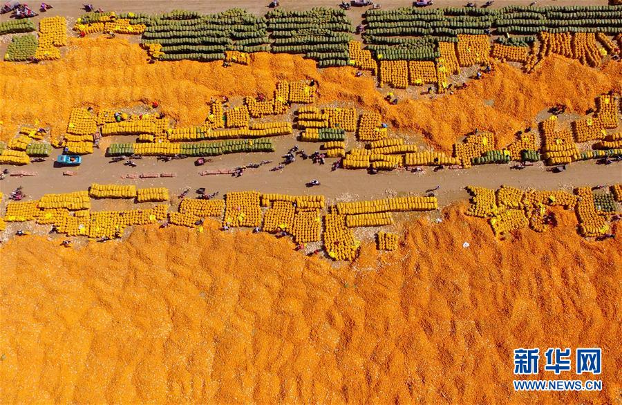 10月14日,河北省南和縣閆里鄉(xiāng)閆里村農(nóng)民在晾曬收獲的玉米(無人機(jī)拍攝)。