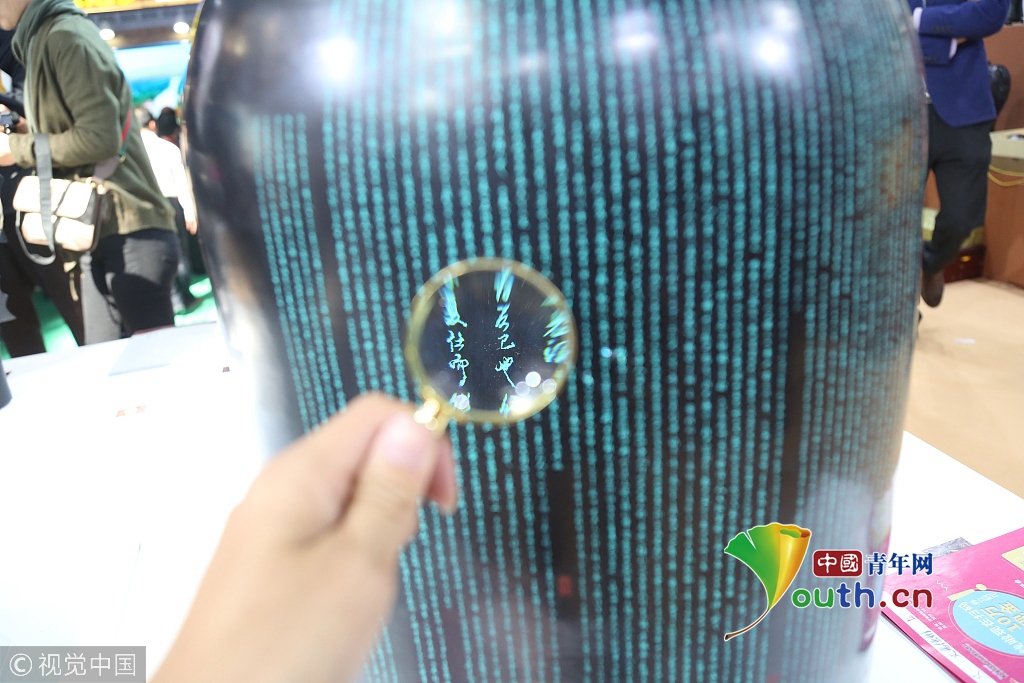 2018年10月14日,山東濟南,高新會展中心濟南文博會現(xiàn)場,張務(wù)福老先生在黑陶鼎上刻字。