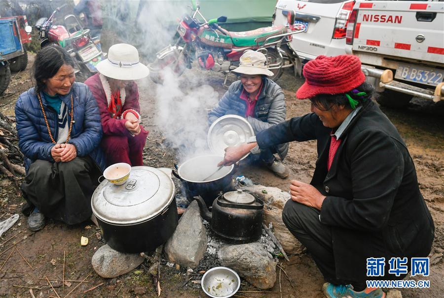 波羅鄉(xiāng)一臨時安置點內(nèi)的群眾在燒水做飯(10月14日攝)。 新華社記者 劉東君 攝