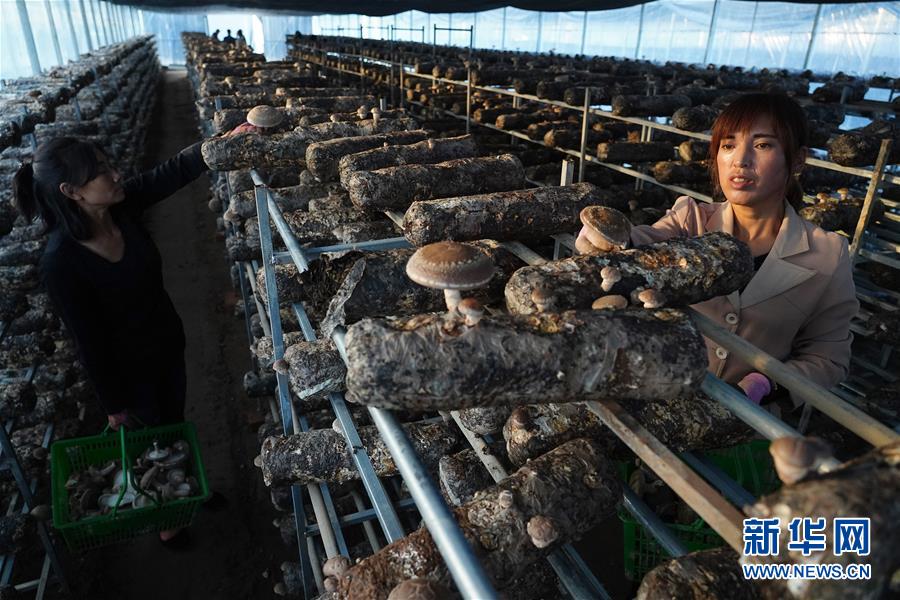 10月15日,黃連河村村民董紅珍(右)、陳小茹在林下生態(tài)產(chǎn)業(yè)園的大棚內(nèi)采摘蘑菇。新華社記者王化娟 攝