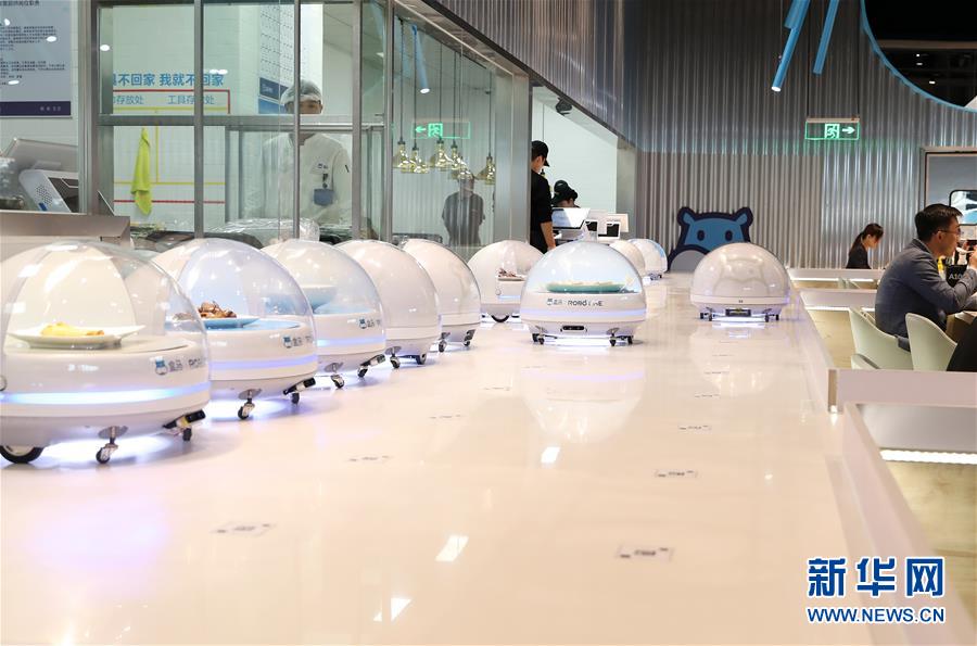 近日,一家由機器人充當送餐服務員的盒馬機器人餐廳現(xiàn)身上海國家會展中心,為顧客帶來一種用餐新選擇。
