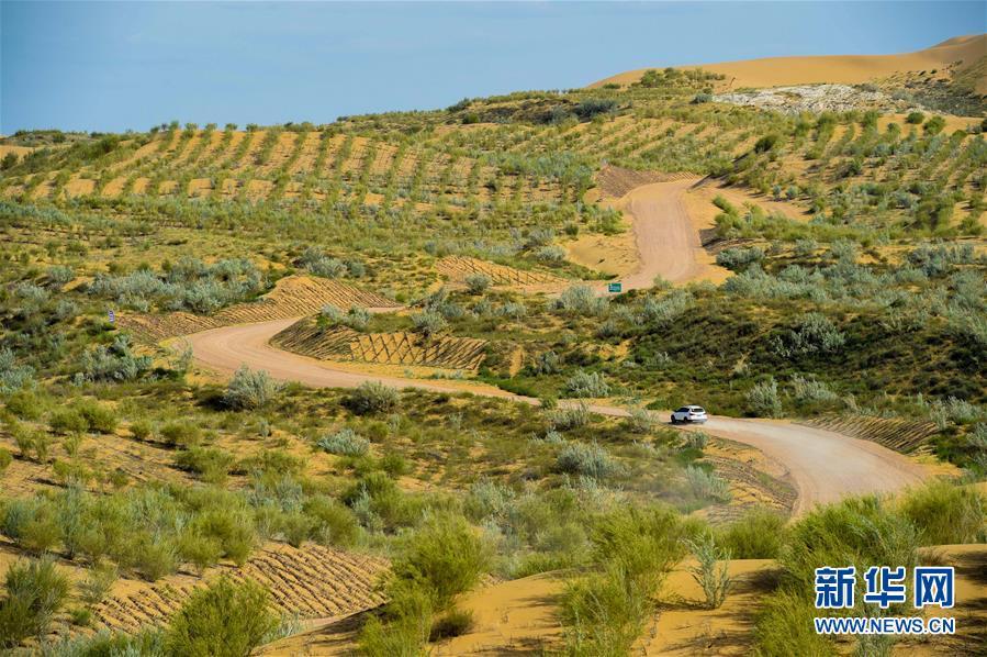 庫布其沙漠中的一條穿沙公路,兩旁綠意盎然(8月1日無人機拍攝)。 新華社記者劉磊攝
