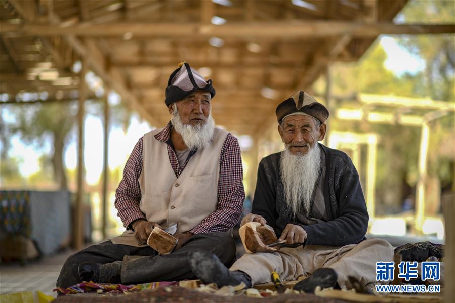 10月16日,在羅布人村寨,村民蘇來曼·托合提(左)和買買提·庫爾班在手工制作“卡盆”(用一根胡楊木鑿空而成的獨木舟)模型。 新華社記者 趙戈 攝