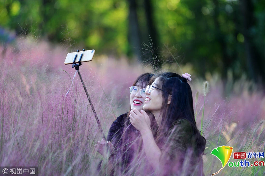 中國青年網北京10月7日電 2018年10月6日,游客在“粉色田野”里游玩、留影。粉黛亂子草是一種觀賞草種,該植物夏季為主要生長季,全株綠色,花期為9月中旬至11月中旬,開花時,綠葉為底,粉紫色花穗如發(fā)絲從基部長出,遠看如紅色云霧。