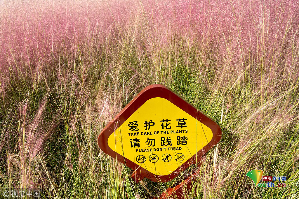 當?shù)貢r間2018年10月16日,韓國蔚山,近日,蔚山公園大片粉黛亂子草盛開,粉紅花海浪漫十足,但部分花海遭游客隨意踩踏。公園并沒有修復遭破壞區(qū)域,而是用繩索圍起并掛上批判性告示,呼吁游客腳下留情。圖片作者:Yonhap News Agency