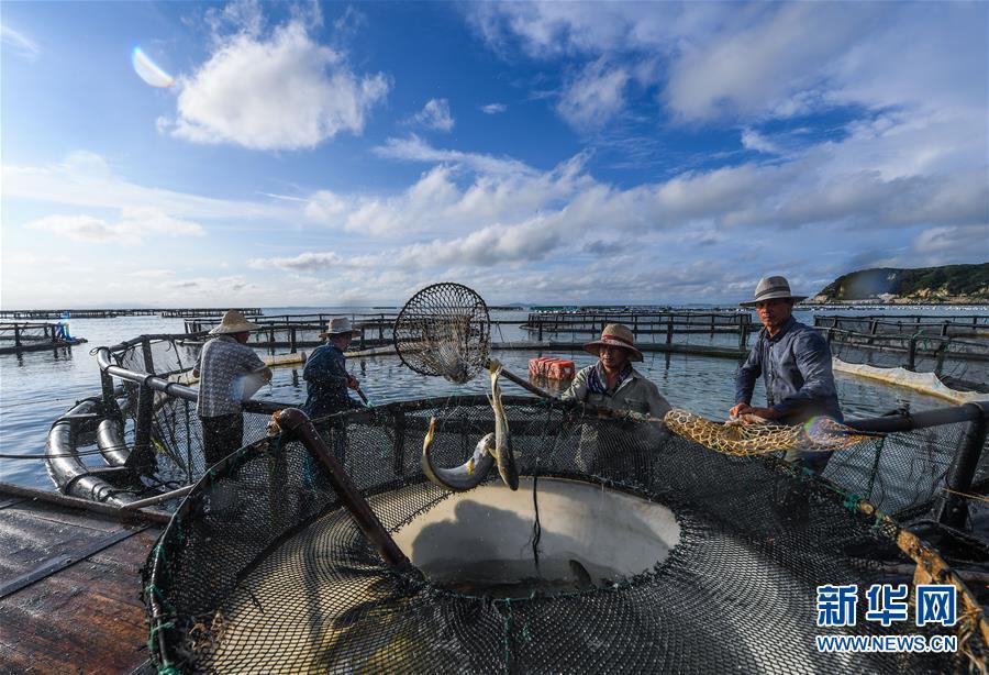 8月18日,南麂島海域內的“海上牧場”養(yǎng)殖區(qū)內,漁民正捕撈大黃魚,處于仿生養(yǎng)殖環(huán)境的大黃魚需要生長2至3年。進入8月,浙江省溫州市平陽縣南麂鎮(zhèn)海域上大片的大黃魚、貽貝等特色海產品養(yǎng)殖區(qū)域迎來豐收季節(jié),養(yǎng)殖戶們駕駛漁船在養(yǎng)殖區(qū)海域進行打撈收獲,在碧海藍天下構成了一幅“海上牧場”的美麗豐收景象。近年來,南麂鎮(zhèn)政府引導漁民養(yǎng)殖戶充分發(fā)揮“靠海吃?!钡馁Y源優(yōu)勢,大力發(fā)展海洋養(yǎng)殖經濟和海島旅游經濟,實現(xiàn)了南麂由“生態(tài)美”向“產業(yè)美”,“產業(yè)美”向“經濟美”的轉變。同時該鎮(zhèn)堅持以大黃魚、貽貝等為特色產業(yè)支撐,精準發(fā)展高效海洋養(yǎng)殖業(yè),重點培養(yǎng)一批新型職業(yè)漁民,依靠專業(yè)技術支持,實現(xiàn)深海仿生養(yǎng)殖,讓好生態(tài)造就好品質,重點打造南麂養(yǎng)殖品牌,組建營銷網(wǎng)絡,拓展特色海產品市場。新華社記者 徐昱攝