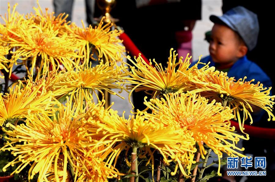 10月17日,一名小朋友在開封龍亭公園內觀看菊花。重陽時節(jié),各色菊花競相綻放,把古都開封裝點得分外秀美,吸引眾多游客前來觀賞游玩。 新華社記者 李安 攝
